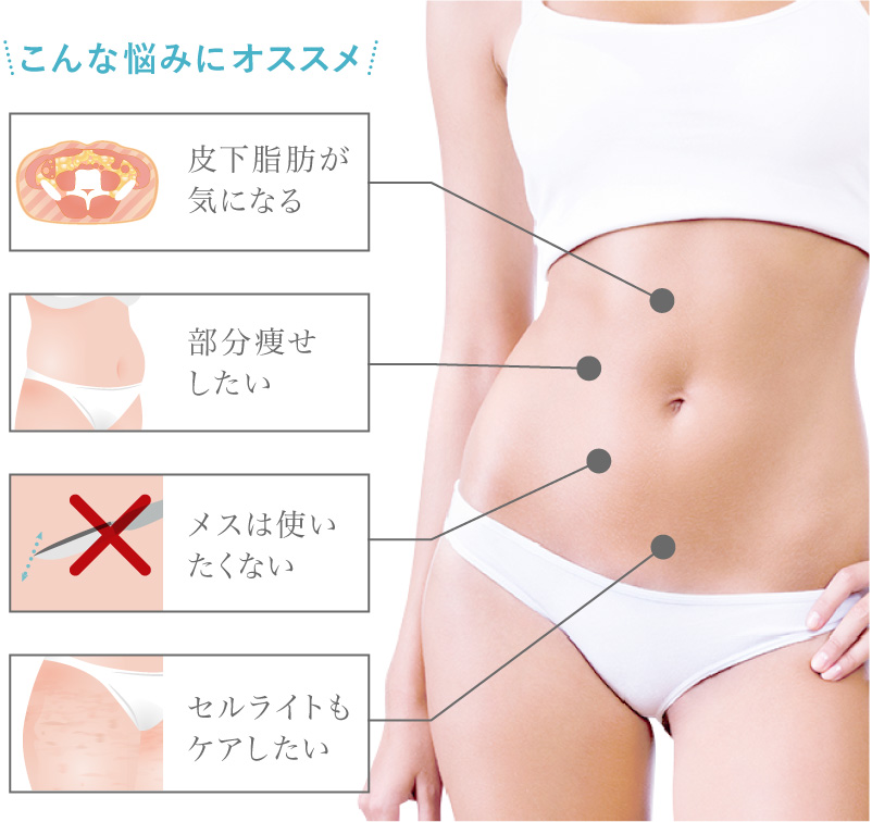 皮下脂肪に脂肪を溶解する効果のある薬剤を注入し、脂肪細胞を溶解することで気になる部分を短期間でサイズダウンする治療です。特に部分痩せに適しており、頑固なセルライトにも効果を発揮します。注入に使?する針は極細なので痛みがほぼなく、傷跡も残りません。