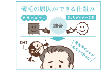 「5αリダクターゼの働きを妨げ、薄毛の原因となるDHT生成を防ぐことで、薄毛の進行を止める効果が期待できます。